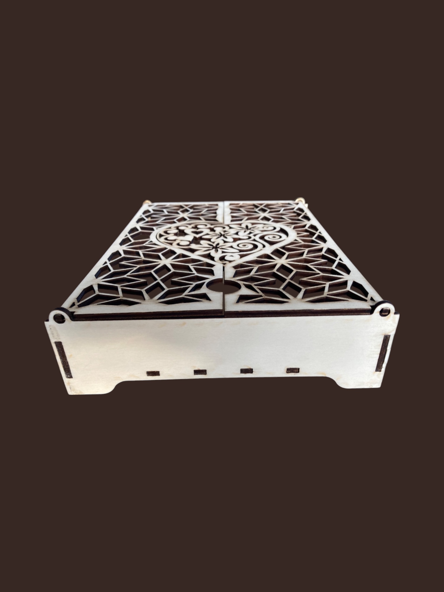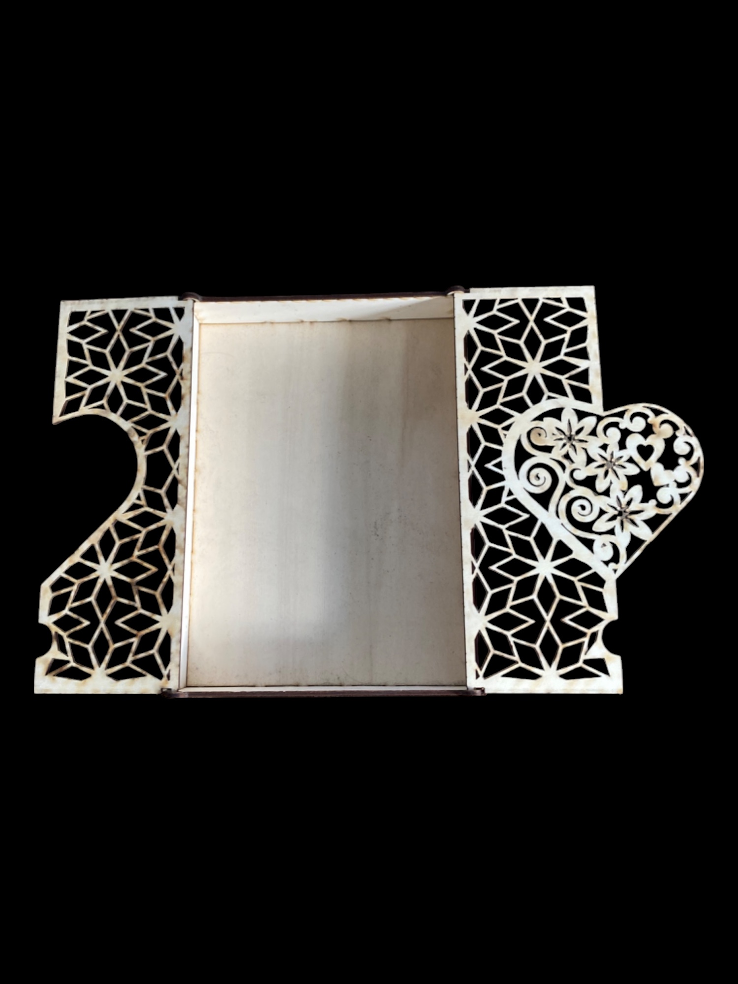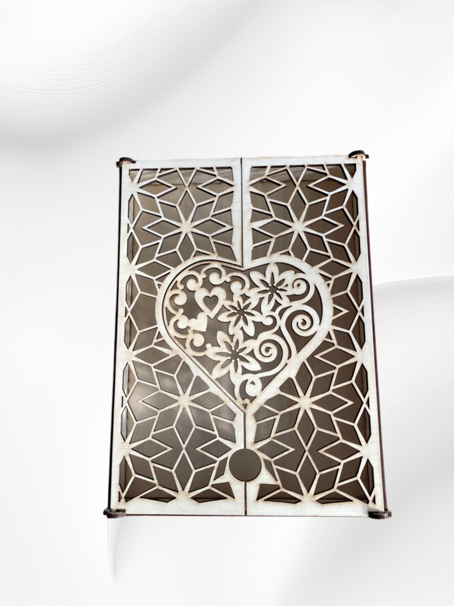Le couvercle ajouré, découpé avec précision au laser, s’ouvre en deux parties pour révéler un superbe motif en forme de cœur au centre. Ce détail raffiné apporte une touche romantique et personnalisée, idéale pour des occasions spéciales comme les mariages, les anniversaires ou les déclarations d’amour.