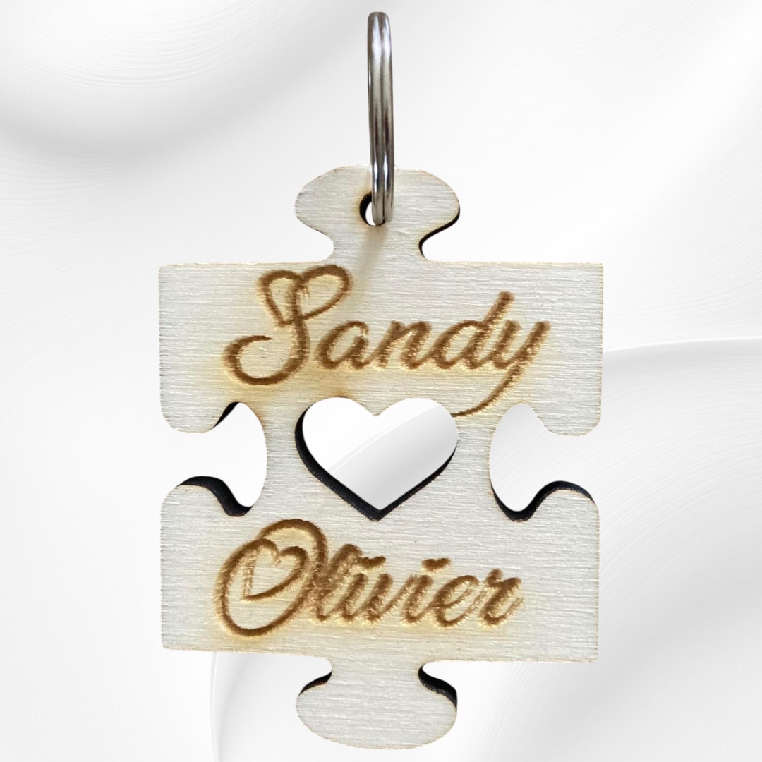 Offrez un cadeau unique et symbolique avec ce porte-clé en forme de pièce de puzzle personnalisée. Fabriqué en bois de peuplier de 5 mm d’épaisseur, ce porte-clé est conçu pour célébrer l’amour et l’union des couples. Personnalisez-le avec les prénoms des amoureux pour un présent touchant et inoubliable. Un petit cœur découpé au centre ajoute une touche romantique, tandis que l’anneau en métal permet de l’accrocher facilement à un trousseau de clés.