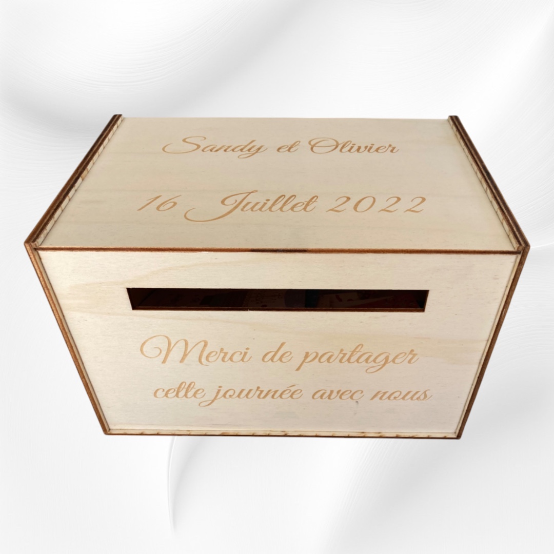 L’urne de mariage personnalisée en bois est un élément incontournable pour votre réception. Conçue en bois de peuplier de 3 mm d’épaisseur, elle allie finesse et solidité pour recueillir avec élégance les enveloppes et messages de vos invités. Grâce à la personnalisation par découpe laser ou gravure laser, vous pouvez y inscrire les prénoms des mariés et la date du mariage, rendant cet objet unique et mémorable.